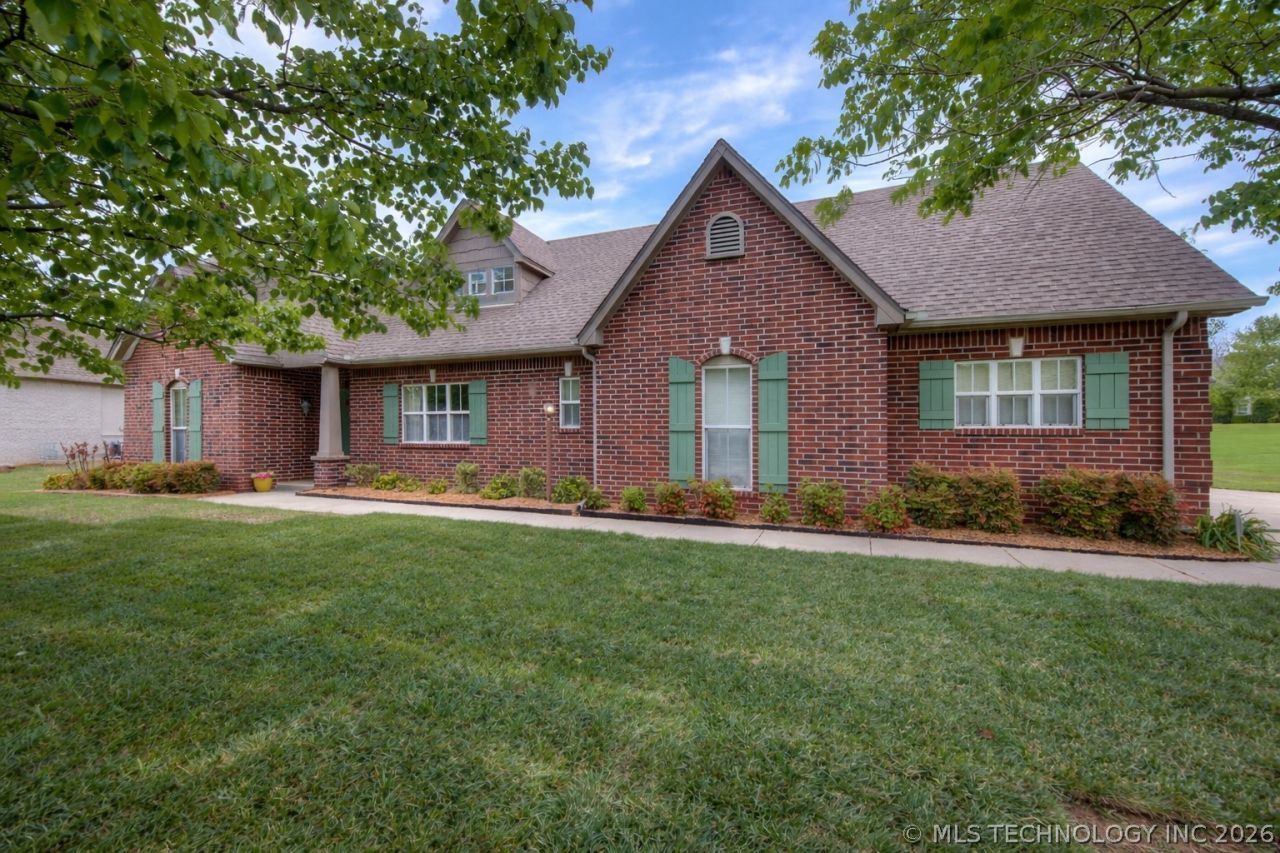 Elegant custom-built one level full-brick home on a large corner lot in the beautiful neighborhood of Ridgewood. Generous-sized rooms and abundant storage throughout. Thoughtfully designed floorplan includes split-bedroom layout, an open living/ dining/kitchen concept with 9ft+ ceilings, and no wasted spaces. In addition to 3 bedrooms and 2.5 baths, there is a bonus flex space with access to the side patio that would make a great Exercise Room, Nursery, Pocket Office or Meditation Space. If you love to cook, you'll love the graceful Kitchen that serves up plentiful custom cabinetry, including pull out storage and soft-close drawers, and is topped with solid-surface counters, tumbled marble backsplash and under-cabinet accent lighting. There is a full-complement of stainless appliances, including a chef's 5-burner gas range with electric double ovens. The large island also offers a built-in casual dining table for enjoying a quick meal. The adjacent large dining area will accommodate a table for 8. A screened-in patio is beckoning to be enjoyed year-round, plus there are two more patios for additional outdoor enjoyment, with one off the bonus space that would make a perfect spot to add a hot tub. Looking for a place to tinker? The oversized 2.5 car garage has lots of space for a workshop, with easy access to the half-bath right inside the house. 3-car wide driveway parking. Also included is a tornado shelter, a 3-year old roof, plus a 1-year home warranty provided by the Seller for additional peace of mind. Convenient location off of Route 66 ... Just 10 minutes to shopping, dining, highways and Hard Rock Casino and 5 minutes to see the famous Blue Whale attraction, currently receiving a glow-up!